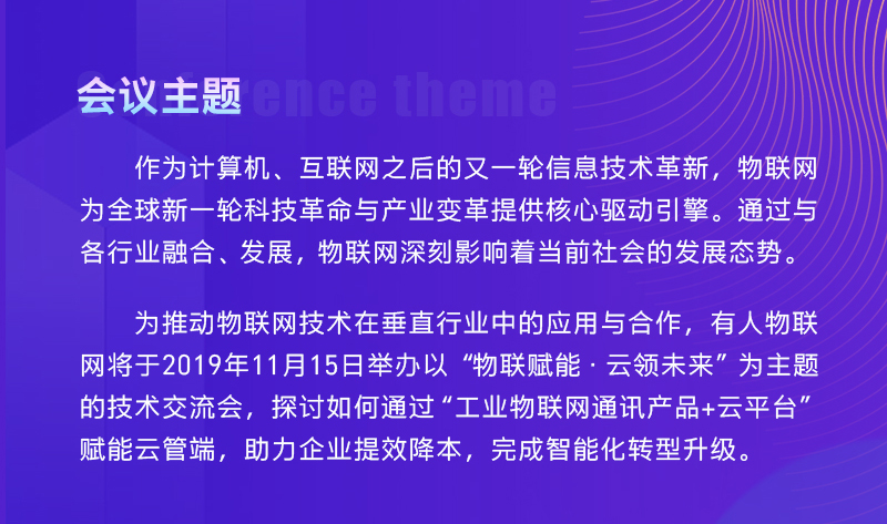 為推動物聯(lián)網(wǎng)技術(shù)在垂直行業(yè)中的應(yīng)用與合作,有人物聯(lián)網(wǎng)將于2019年11月15日(本周五),在位于濟南東部新城區(qū)中心地帶的五星級豪華酒店——喜來登,舉辦以“物聯(lián)賦能·云領(lǐng)未來”為主題的技術(shù)交流會,探討如何通過“工業(yè)物聯(lián)網(wǎng)通訊產(chǎn)品+云平臺”賦能云管端,助力企業(yè)提效降本,完成智能化轉(zhuǎn)型升級。