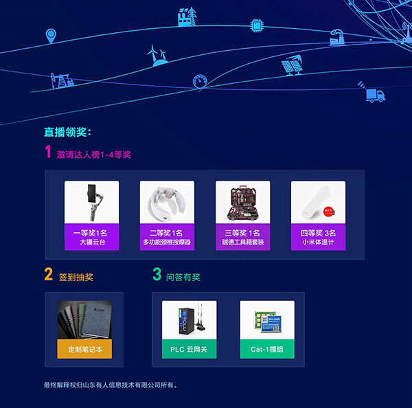 除在現(xiàn)場進(jìn)行常規(guī)展示外,有人物聯(lián)網(wǎng)還將開放線上直播間,為異地客戶提供“云參展”服務(wù)。屆時,我們將邀請重磅嘉賓帶來“有人物聯(lián)網(wǎng)新技術(shù)分享”,為大家提供“智能硬件上云服務(wù)”、“智能方案展示”、“5G/Cat-1/NB-IoT新產(chǎn)品介紹”等直播干貨,期間好禮不斷,歡迎大家參加。