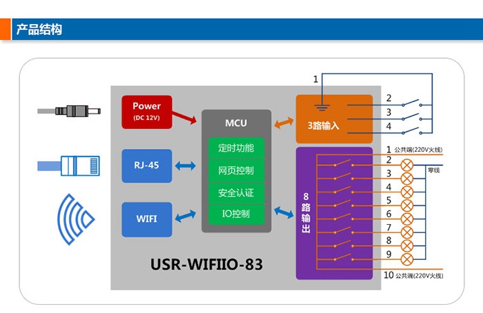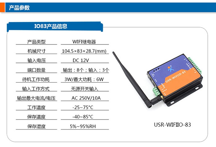 USR-WIFI-IO-83控制終端是有人物聯(lián)網(wǎng)研發(fā)的用于智能家居、物聯(lián)網(wǎng)等領(lǐng)域的終端設(shè)備,只要使用掌控寶的windows/IOS/Android等平臺(tái)的控制軟件,用戶便可輕松實(shí)現(xiàn)“局域網(wǎng)和遠(yuǎn)程的監(jiān)測(cè)控制”。 USR-WIFI-IO-83同時(shí)支持WIFI和網(wǎng)線連接,支持三路開(kāi)關(guān)量監(jiān)測(cè)(輸入),八路繼電器控制(輸出)。 |
