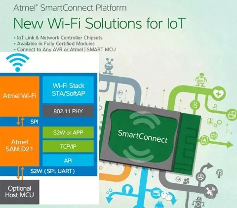 鑒于物聯(lián)網(wǎng)市場的強大攻勢,Atmel在融合其在無線與控制兩方面的強大優(yōu)勢,2014年6月份,Atmel推出了全新的MCU品牌--Atmel SMART以及SmartConnect SAM W23模塊,該模塊基于 Atmel超低功率WiFi系統(tǒng)芯片,實現(xiàn)了低功率MCU與Wi-Fi解決方案的結(jié)合。SAM W23模塊整合了WiFi功能,設(shè)計人員無需再學(xué)習(xí)WiFi堆棧,從而能夠?qū)W⒂谔嵘a(chǎn)品功能。