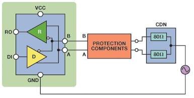 電阻將浪涌瞬變耦合到通信線路上。上圖顯示了半雙工RS-485設(shè)備的耦合網(wǎng)絡(luò)。電阻的總并聯(lián)總和為40。對(duì)于半雙工設(shè)備,每個(gè)電阻為80。