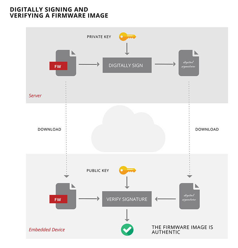 很明顯,因為使用私鑰進行數(shù)字簽名的任何文件都會被認證為合法文件,所以私鑰必須安全地保存在安全的地方,以免被別人濫用。所以,我們提供了一種方法來證明其下載的固件映像和來源可靠的固件映像一樣,所以安裝是安全的,還是偽造的而且肯定無法安裝。