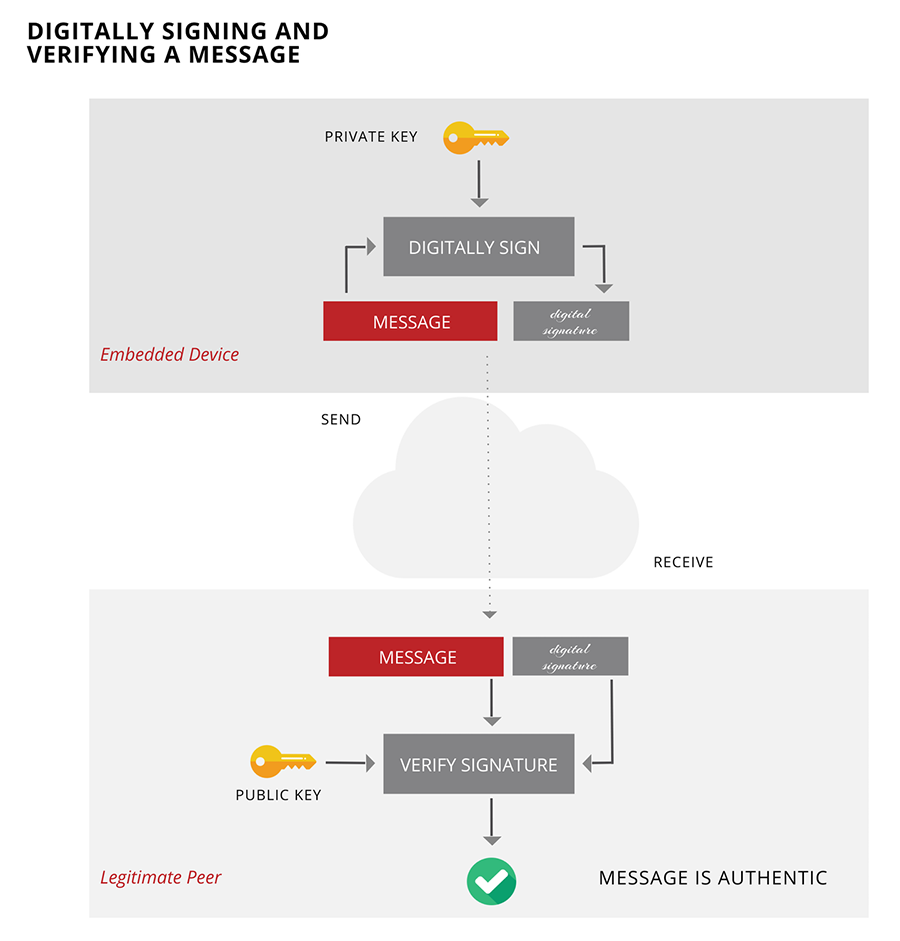 盡管我們現(xiàn)在有一種安全地共享秘密密鑰的方法,但這僅有助于保護我們的嵌入式設(shè)備免于因某種原因而發(fā)現(xiàn)用于與合法對等方通信的密鑰的破壞。我們還必須解決黑客可能將嵌入式設(shè)備冒充給合法對等設(shè)備,反之亦然,并尋求獲得其自己的密鑰的可能性!
