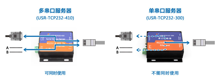 串口服務(wù)器分為單串口服務(wù)器和多串口服務(wù)器,“有人”的T24系列為單串口方案(-300典型,485和232二選一,不能同時(shí)使用),M4系列為多串口方案(-410典型,485和232可同時(shí)使用)。 |