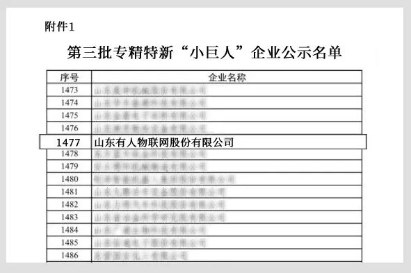 近期,工業(yè)和信息化部公示了第三批國家級(jí)專精特新“小巨人”企業(yè)名單,山東有人物聯(lián)網(wǎng)股份有限公司被工信部認(rèn)定為國家級(jí)專精特新“小巨人”企業(yè)。