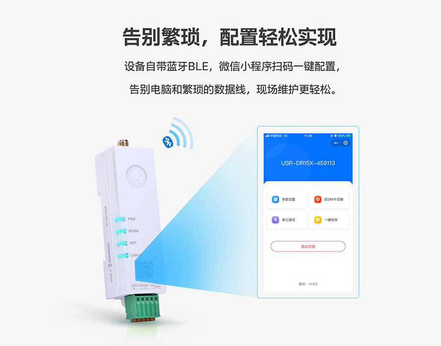 首先,DR154采用人性化設計,設備自帶藍牙BLE,用戶無需了解復雜的數(shù)據傳輸過程,也無需攜帶笨重的電腦,只需拿出手機,掃描DR154外殼上的二維碼,自動開啟藍牙建立連接,通過簡單配置,即可進行無線數(shù)據收發(fā),完美解決小數(shù)據量在復雜環(huán)境中的超遠距通信問題。
