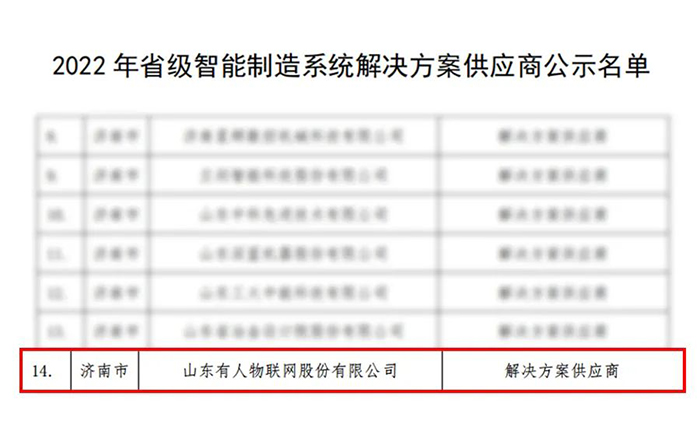 近日,山東省工業(yè)和信息化廳陸續(xù)公示了山東省第一批優(yōu)秀數(shù)字產品、山東省智能制造系統(tǒng)解決方案供應商名單,有人物聯(lián)網憑借技術優(yōu)勢,科研能力與綜合實力強勢入選兩個榜單。兩項殊榮加冕,標志著有人在智能制造領域的核心競爭力已經位居全省前列。