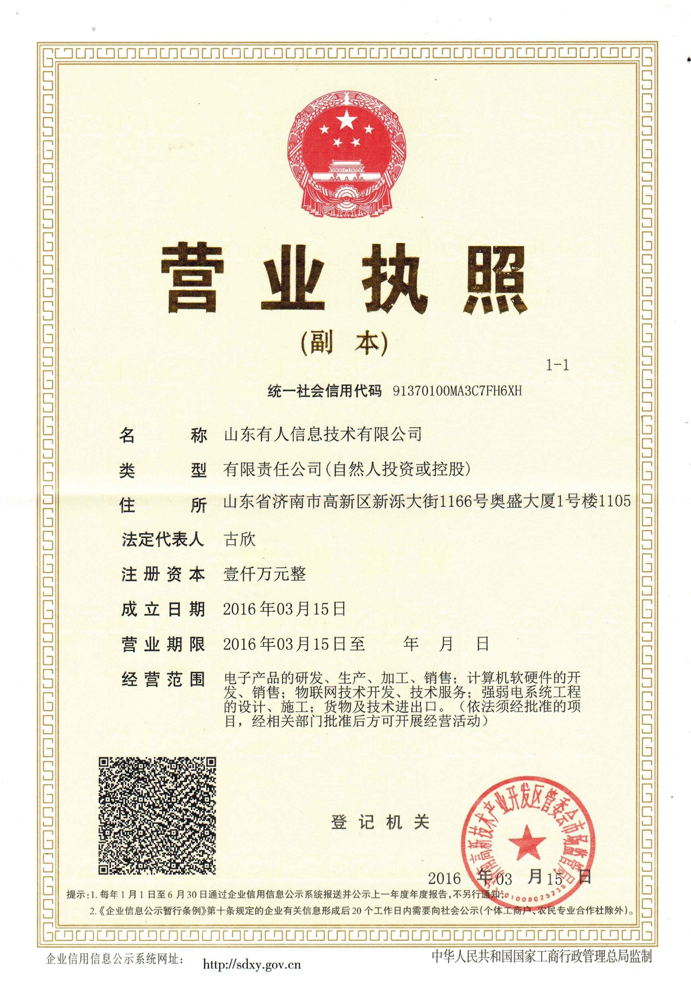 2016年3月15日,山東有人信息技術(shù)有限公司在山東濟(jì)南注冊(cè)成功,標(biāo)志著有人物聯(lián)網(wǎng)昂首闊步的走向信息技術(shù)領(lǐng)域。