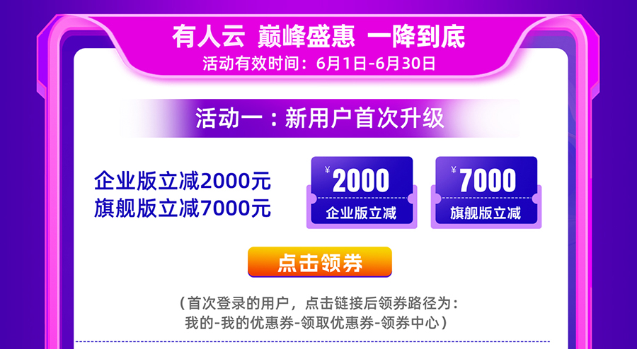 活動(dòng)一:優(yōu)惠券一個(gè)訂單僅可使用一張,只針對(duì)有人云企業(yè)版和旗艦版可用,其他單品不參與本次活動(dòng);