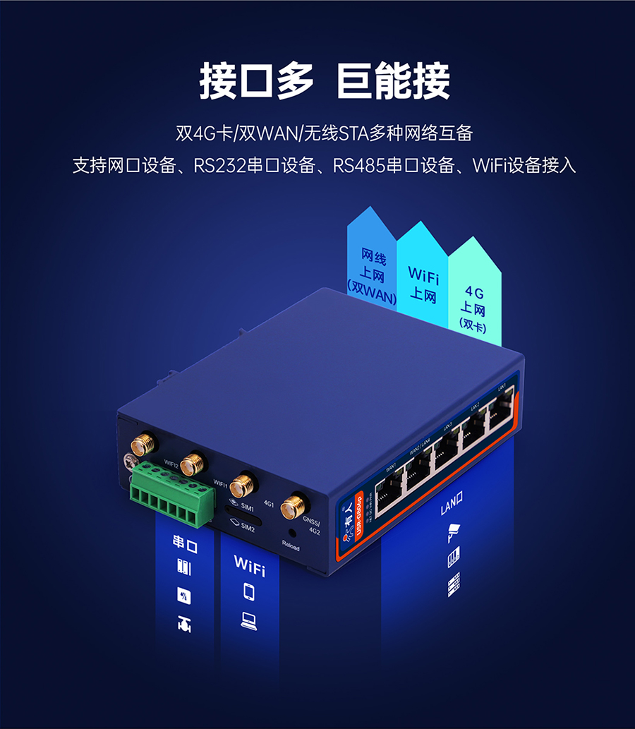 ● 【接口多,巨能接】5網(wǎng)口+雙串口+雙SIM卡+WiFi,工業(yè)設(shè)備接線的“超級管家”!PLC、攝像頭、傳感器等一機(jī)全納,告別擴(kuò)展塢堆疊。