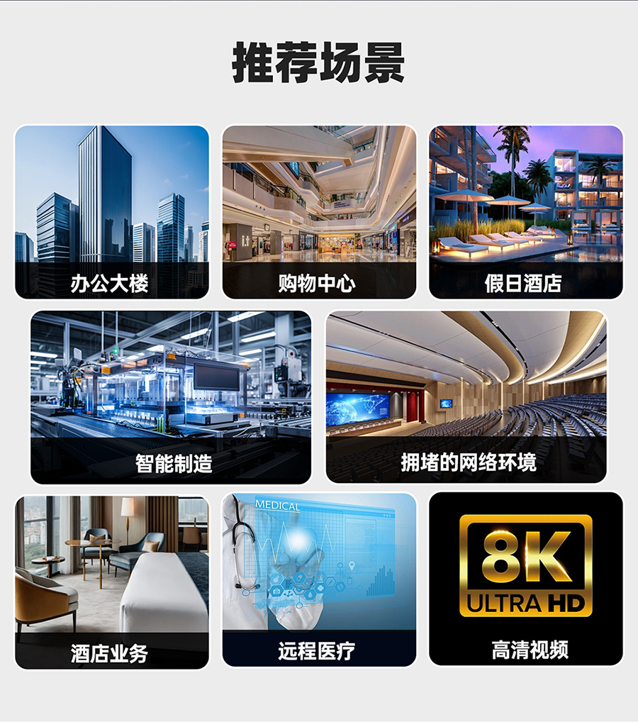 辦公大樓、智能制造、購(gòu)物中心、遠(yuǎn)程醫(yī)療、高清視頻等高密度、高容量