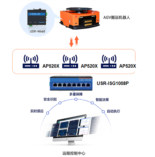 ●無線層:AP部署于倉庫頂部,USR-W660安裝在AGV頂部天線罩內(nèi),實(shí)現(xiàn)-65dBm低信號(hào)強(qiáng)度下的穩(wěn)定通信。