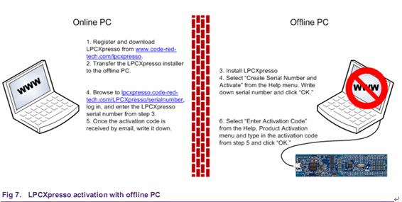 想要激活你的LPCXpresso,首先運(yùn)行該軟件,按照如下步驟操作:Help->;Product activation->Create Serial number and Activate 當(dāng)頁(yè)面打開(kāi)后,單擊“ copy to clipboard”,復(fù)制LPCXpresso的序列號(hào)到clipboard中,這個(gè)序列號(hào)是基于你的計(jì)算機(jī)硬件和操作系統(tǒng)配置生成的,不過(guò)不包含個(gè)人隱私信息。然后單擊按鈕進(jìn)入注冊(cè)激活頁(yè)面,激活頁(yè)面以網(wǎng)頁(yè)形式顯示。完成這些內(nèi)容后,稍等幾分鐘,你會(huì)在你的注冊(cè)郵箱中收到包含激活碼的郵件。從郵箱中復(fù)制激活碼并放入clipboard窗口內(nèi)。然后選擇Help->;Product activation->Enter Activation code。將產(chǎn)品激活碼填入激活碼對(duì)話框中。最后單擊“OK”按鈕。將會(huì)彈出一個(gè)激活碼確認(rèn)對(duì)話框。對(duì)于不能上網(wǎng)的情況來(lái)說(shuō),也可以完成激活功能。參考下圖。