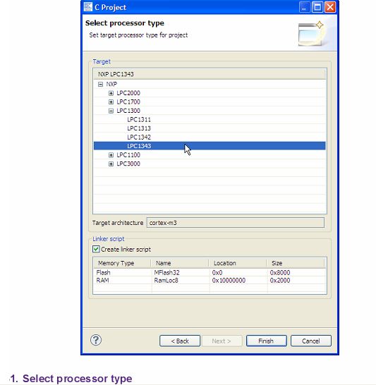 最后,彈出“SelcetProcessorType”對(duì)話框。在這里選擇MCU的型號(hào)。然后單擊“Finish”。至此完成了一個(gè)項(xiàng)目的創(chuàng)建。本項(xiàng)目中MCU型號(hào)是LPC1343。如下圖所示。