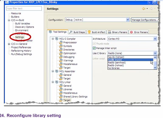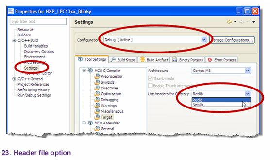 6.3 代碼長(zhǎng)度6.3.1 格式輸出 當(dāng)優(yōu)化項(xiàng)目大小時(shí),如果使用格式輸出,必須在項(xiàng)目屬性對(duì)話框中將Redlib選為標(biāo)準(zhǔn)庫(kù)。這個(gè)選項(xiàng)必須在兩個(gè)位置進(jìn)行設(shè)置:頭文件、庫(kù)。最好也要在調(diào)試目標(biāo)和發(fā)布目標(biāo)這兩處進(jìn)行設(shè)置。頭文件選項(xiàng)在左側(cè)的樹形文件列表的C/C++ Build文件夾中。需要確認(rèn)工具設(shè)置標(biāo)簽是否處于激活狀態(tài),并且在右側(cè)的樹形文件列表中選擇MCU C Compiler下面的Target,在設(shè)置選框中選擇調(diào)試或者發(fā)布目標(biāo),在C庫(kù)頭文件下選擇Redlib,這個(gè)通常是默認(rèn)設(shè)置。如下圖所示。 在相同的對(duì)話框中,選擇MCU Linker下面的Target選項(xiàng),再次設(shè)置鏈接時(shí)的標(biāo)準(zhǔn)庫(kù)函數(shù)為Redlib。默認(rèn)設(shè)置是Redlib(semihost),語序所有I/O通過LPCXpresso控制臺(tái)連接到PC。如下圖所示。