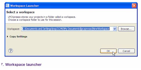 6.5 在新工作區(qū)創(chuàng)建一個(gè)‘skeleton’項(xiàng)目 LPCXpresso包含多種項(xiàng)目模板以幫助快速建立項(xiàng)目文件。6.5.1 創(chuàng)建一個(gè)新工作區(qū) 從“File”菜單中選擇“Switch Workspace”,然后選擇“Other…”。將會(huì)彈出一個(gè)“Workspace Launcher”對(duì)話框。輸入或者選擇一個(gè)新的路徑,在此將這個(gè)新工作區(qū)命名為“NewWorkspace”。如下圖所示。