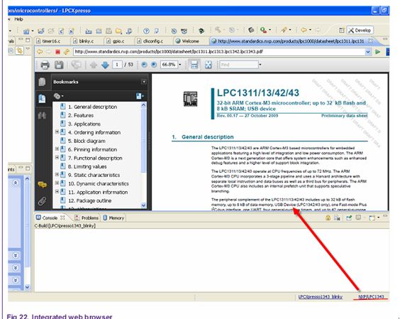 6.1.5 退出調(diào)試模式并停止調(diào)試 在調(diào)試窗口中的工具欄內(nèi)點(diǎn)擊”Stop”按鈕(紅色方形按鈕),即可終止調(diào)試并退出調(diào)試模式。6.1.6 程序下載。要想獲得最好的編程和調(diào)試效果,計(jì)算機(jī)的操作系統(tǒng)應(yīng)該是Vista 或者Windows 7,在Windows XP操作系統(tǒng)下,調(diào)試運(yùn)行的速度明顯要慢一些。但是并不影響代碼的執(zhí)行速度,只是軟件的響應(yīng)速度等變慢了。同樣需要確認(rèn)LPCXpresso開發(fā)板正確的直接連接到PC機(jī)上。通過hub、網(wǎng)關(guān)或USB分線器連接的效果不是很好。6.2 數(shù)據(jù)手冊(cè)閱覽器 LPCXpresso內(nèi)置了一個(gè)集成網(wǎng)頁(yè)瀏覽器,在項(xiàng)目中直接點(diǎn)擊右下角的MCU型號(hào),就可以查看該型號(hào)MCU的數(shù)據(jù)手冊(cè)。如下圖所示。