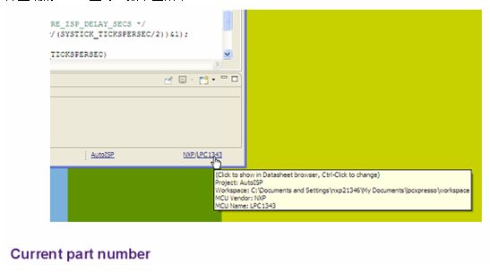 確認(rèn)MCU型號(hào)是否正確。當(dāng)前選擇的MCU型號(hào)在LPCXpresso界面窗口下面的狀態(tài)欄中顯示。通過按住鍵盤上的“Ctrl”鍵并點(diǎn)擊可以修改MCU型號(hào)。在彈出的對(duì)話框中選擇正確的MCU型號(hào)。如下圖所示。