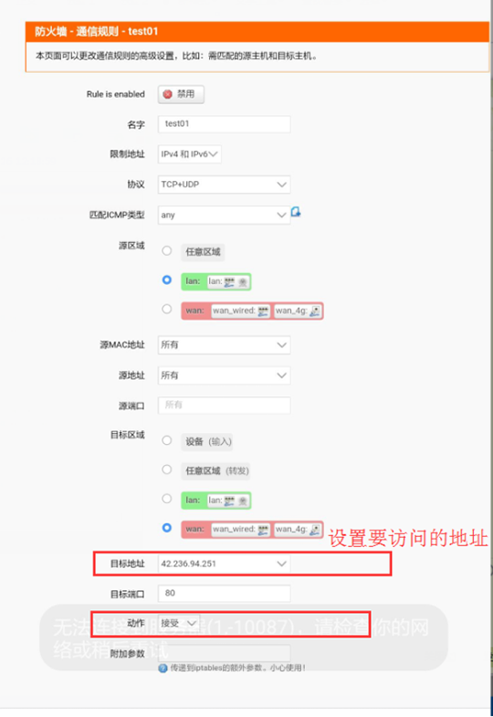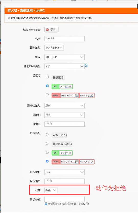 第四步,再次新建一個規(guī)則,用于屏蔽互聯(lián)網(wǎng)網(wǎng)站,“動作”命令中選擇“拒絕”,目標(biāo)地址和MAC地址選擇“所有”,然后進(jìn)行保存,并重啟生效。