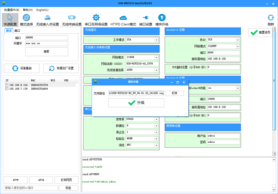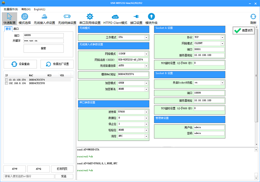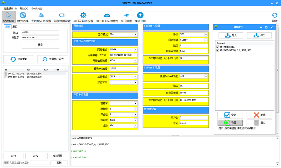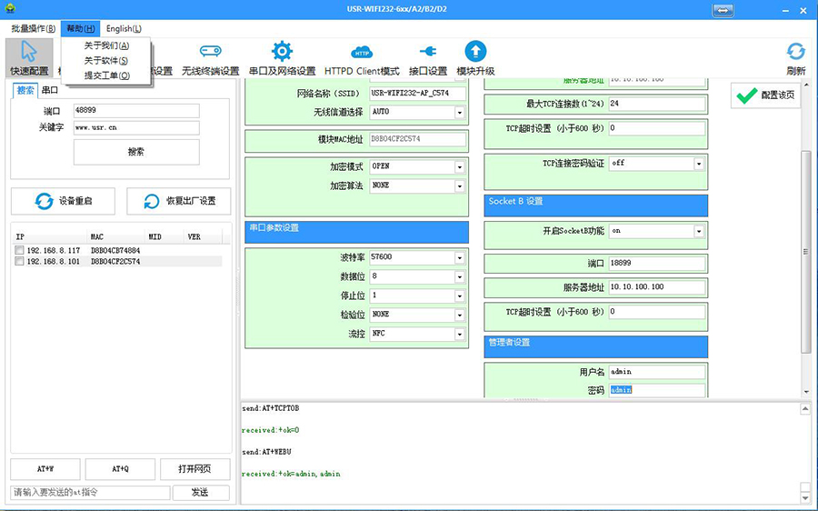 串口連接(或同一局域網(wǎng)內(nèi))可直接查詢及設(shè)置串口服務(wù)器及高性能系列模塊參數(shù)。無需登錄網(wǎng)頁及重復(fù)發(fā)送AT指令。支持一鍵固件升級,批量設(shè)置等功能。