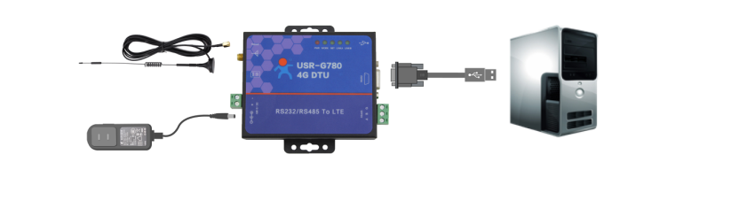 準(zhǔn)備將4G DTU進(jìn)行數(shù)據(jù)透?jìng)髦?,先將電腦串口連接到4G DTU串口上。如果是沒有硬件串口的電腦,可以通過USB轉(zhuǎn)RS232串口轉(zhuǎn)換線進(jìn)行連接,如下圖的連接方式: