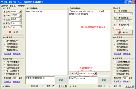 第五,聯(lián)網(wǎng)通信。設(shè)置好上述步驟后,就可以進行聯(lián)網(wǎng)通信了。在自己電腦上建立TCP Server,監(jiān)聽端口,可以查看客戶端連接情況。