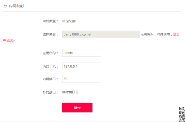 第七,添加、設(shè)置映射。網(wǎng)絡(luò)類型選擇自定義端口,域名選擇選項(xiàng)選擇要映射的域名。內(nèi)網(wǎng)主機(jī)項(xiàng)填寫需要映射的設(shè)備的IP地址,內(nèi)網(wǎng)端口填寫內(nèi)網(wǎng)設(shè)備中的網(wǎng)絡(luò)端口。