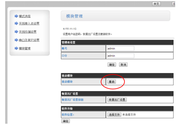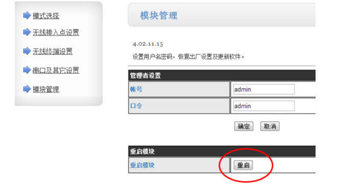 3.在“模塊管理”界面點(diǎn)擊“重啟”,模塊設(shè)置生效。對(duì)AP模塊的設(shè)置完成,將AP模塊斷電。