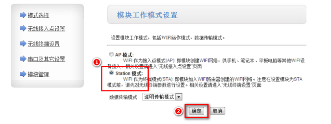 1..電腦與模塊的無(wú)線信號(hào)連接后,打開(kāi)瀏覽器輸入10.10.100.254,賬戶密碼均為admin,進(jìn)入內(nèi)置網(wǎng)頁(yè)設(shè)置界面。設(shè)置模塊為STA模式,點(diǎn)擊“確定”按鈕。