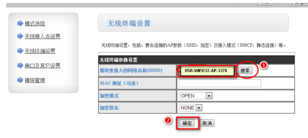 3.進(jìn)入無(wú)線終端設(shè)置界面,點(diǎn)擊搜索,選擇搜索到的AP模塊的SSID,選擇完成后,點(diǎn)擊“確定”保存。