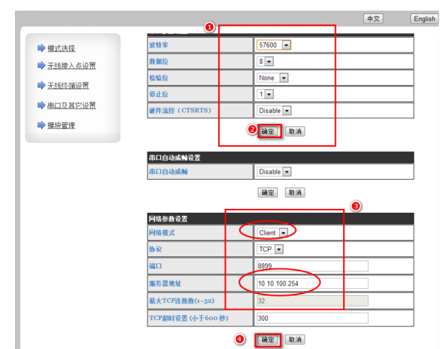 4.進(jìn)入“串口及其它設(shè)置”頁(yè)面后,修改波特率數(shù)據(jù)位檢驗(yàn)為停止位和設(shè)備、AP模塊一致,修改完后點(diǎn)擊”確定“保存,然后將網(wǎng)絡(luò)參數(shù)設(shè)置中的網(wǎng)絡(luò)模式改為Client,服務(wù)器地址改為10.10.100.254,點(diǎn)擊”確定“保存。