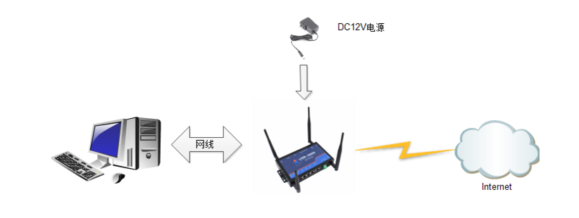 對硬件測試需要計算機一臺、4G工業(yè)路由器USR-G800路由器一臺、網(wǎng)線一根、DC12V電源一個,4G SIM卡一張。硬件連結(jié)構(gòu)進行測試。
