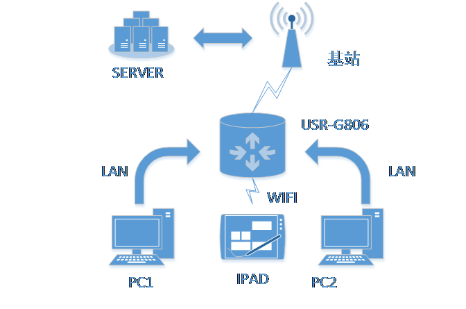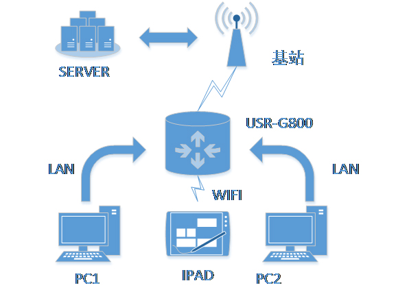 這樣的組網(wǎng)方式下,路由器不需要進行任何設(shè)置,接上網(wǎng)線,插上擁有4G流量的SIM卡,給路由器供電即可。最大程度的減少了客戶的設(shè)置過程,方便快捷。在這種組網(wǎng)方式下,路由器自帶的WIFI的功能也可以同時工作,最大程度的增加用戶的局域網(wǎng)的接入數(shù)量。