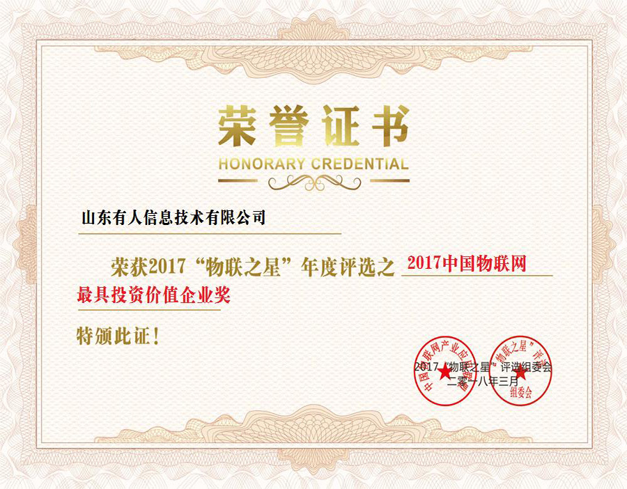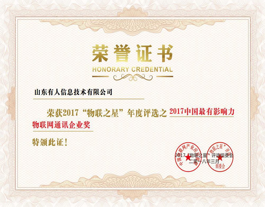 2018年3月19日,“2017物聯(lián)之星-中國物聯(lián)網(wǎng)產(chǎn)業(yè)年度評選”結(jié)果正式揭曉。有人物聯(lián)網(wǎng)憑借自身強(qiáng)勁的綜合實(shí)力得到500位物聯(lián)網(wǎng)專家的認(rèn)可,并最終從300多家物聯(lián)網(wǎng)企業(yè)中脫穎而出,一舉斬獲“2017中國最有影響力物聯(lián)網(wǎng)通訊企業(yè)獎(jiǎng)”、“2017中國物聯(lián)網(wǎng)最具投資價(jià)值企業(yè)獎(jiǎng)”兩大重磅獎(jiǎng)項(xiàng)。