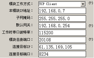 本模塊IP地址 為模塊所在的局域網(wǎng)內(nèi)給模塊分配一個(gè)局域網(wǎng)IP地址如這里的192.168.0.7,子網(wǎng)掩碼保持默認(rèn)255.255.255.0,