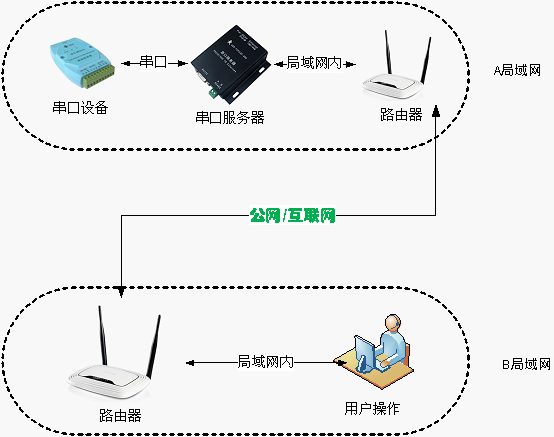 通用串口設(shè)備,需要接受遠(yuǎn)端聯(lián)網(wǎng)用戶的控制和訪問(wèn),串口設(shè)備端只有撥號(hào)上網(wǎng)后建立的局域網(wǎng),無(wú)公網(wǎng)IP。