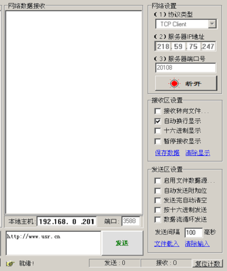 4、至此設(shè)置完成,外網(wǎng)的普通用戶就可以通過(guò)工作在TCP Client模式下的程序連接218.59.75.247連接局域網(wǎng)內(nèi)的串口聯(lián)網(wǎng)設(shè)備從而控制串口,連接界面如下圖: