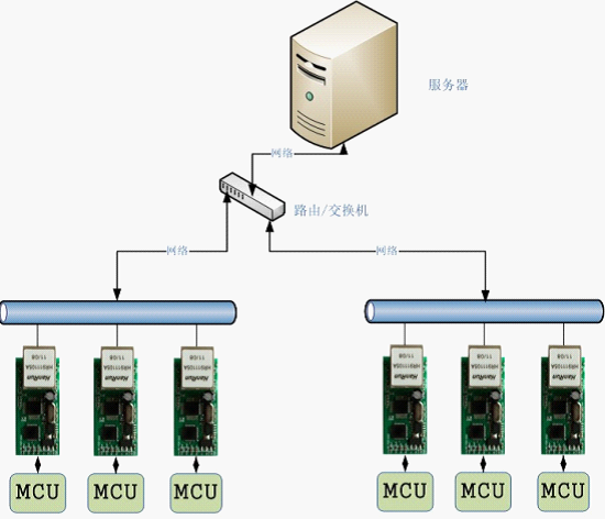 模塊工作在不同的局域網(wǎng)內(nèi),服務(wù)器工作在公網(wǎng)上,并且擁有公網(wǎng)固定IP,模塊將串口接收到的數(shù)據(jù)通過(guò)網(wǎng)絡(luò)發(fā)送給服務(wù)器。應(yīng)用框圖如下: