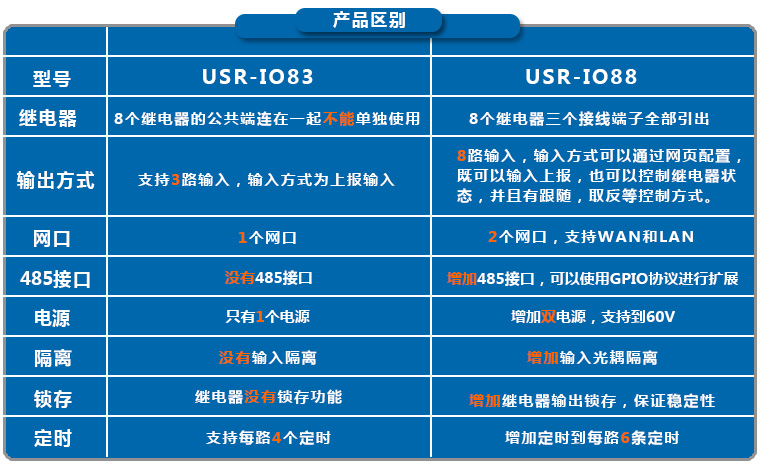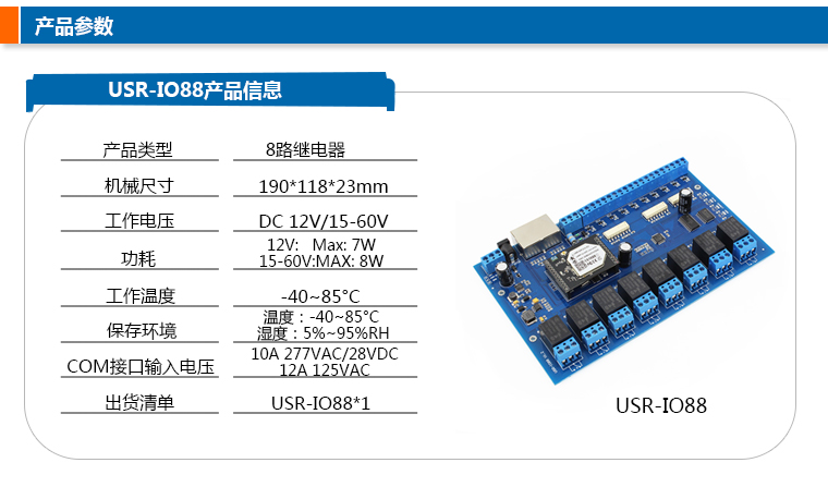 USR-IO88是本公司新推出的8入8出控制設(shè)備,用戶可以在直連,局域,遠(yuǎn)程三種方式下實(shí)時(shí),定時(shí)控制設(shè)備。輸出部分我們將繼電器三個(gè)端子全部引出供用戶使用,輸入部分我們提供網(wǎng)頁配置輸入模式,可在純輸入方式,控制繼電器方式之間任意切換。