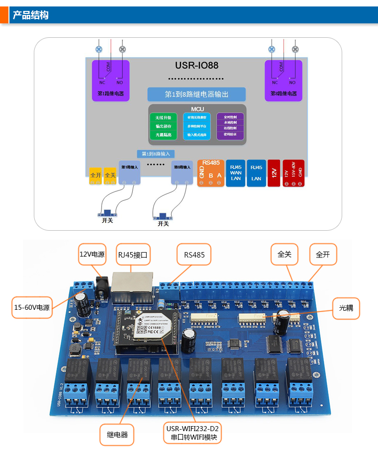 - 8路可配置輸入,既可以上報(bào)輸入狀態(tài)也可以控制繼電器