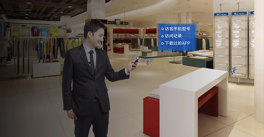 通過藍(lán)牙連接各個(gè)移動(dòng)端設(shè)備,可向顧客發(fā)送廣告咨詢、折扣券以及近點(diǎn)積分等