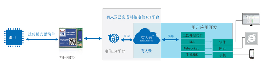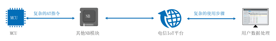 第二種傳輸形式,用戶在使用其他NB模塊、未接入有人云狀態(tài)下,MCU需要進(jìn)行復(fù)雜的AT指令操作,服務(wù)器仍要通過一系列復(fù)雜的操作環(huán)節(jié)才能實(shí)現(xiàn)數(shù)據(jù)透傳,耗費(fèi)時(shí)間和精力。