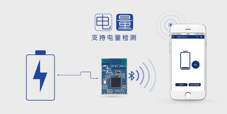 將模塊AD引腳連接電源,輕松獲取電池電量,手機(jī)APP通過模塊內(nèi)置的電池檢測(cè)服務(wù)(Battery Service)輕松讀取當(dāng)前電池電量。