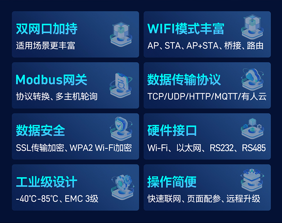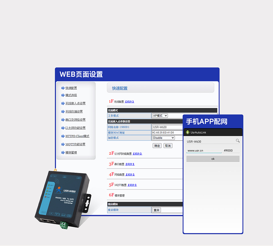 WEB頁面配置/遠程升級、串口/網絡AT指令配置、手機APP配網。