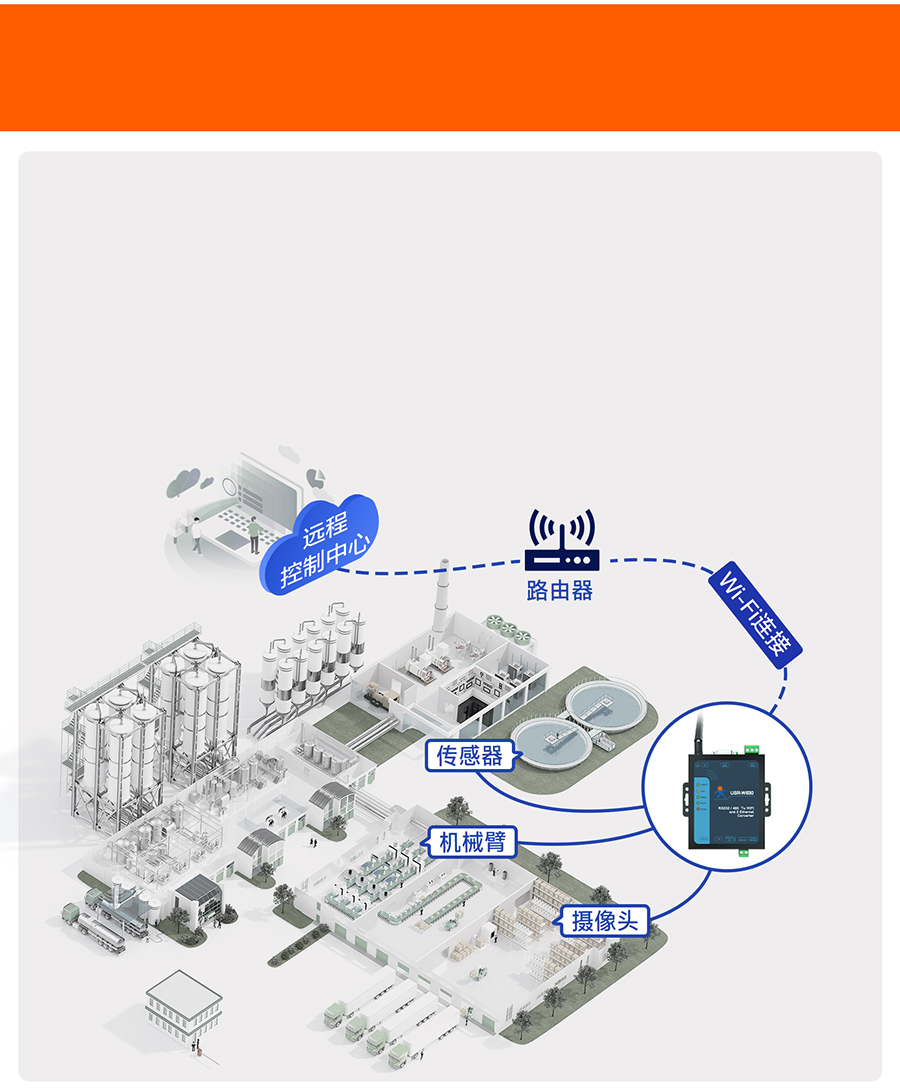 USR-w630與工廠里的串口設備相連,將設備運行數據實時上傳至本地監(jiān)控