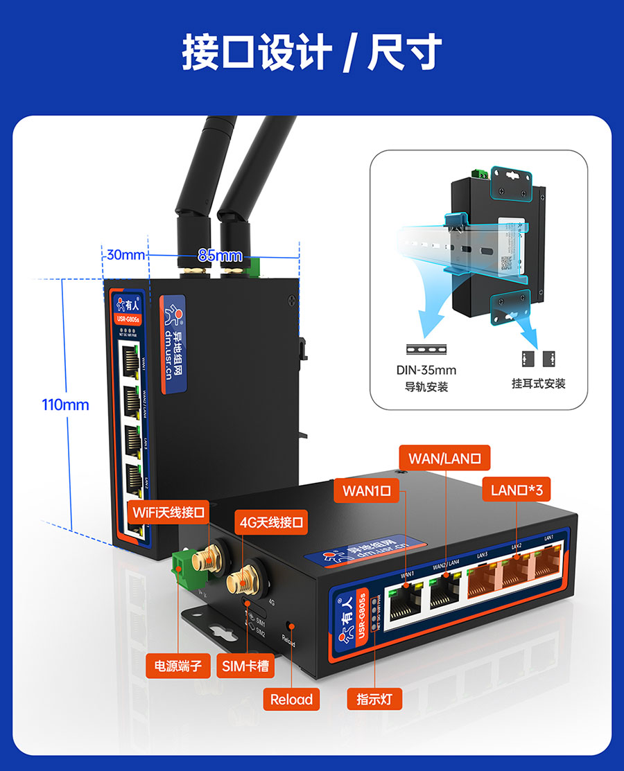 1個WAN接口,1個WAN/LAN接口,3個LAN接口