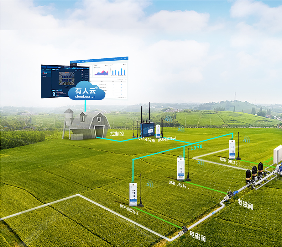 農(nóng)田類傳感器接入USR-DR216-L,通過設(shè)置與LoRa網(wǎng)關(guān)無線數(shù)據(jù)傳輸,
