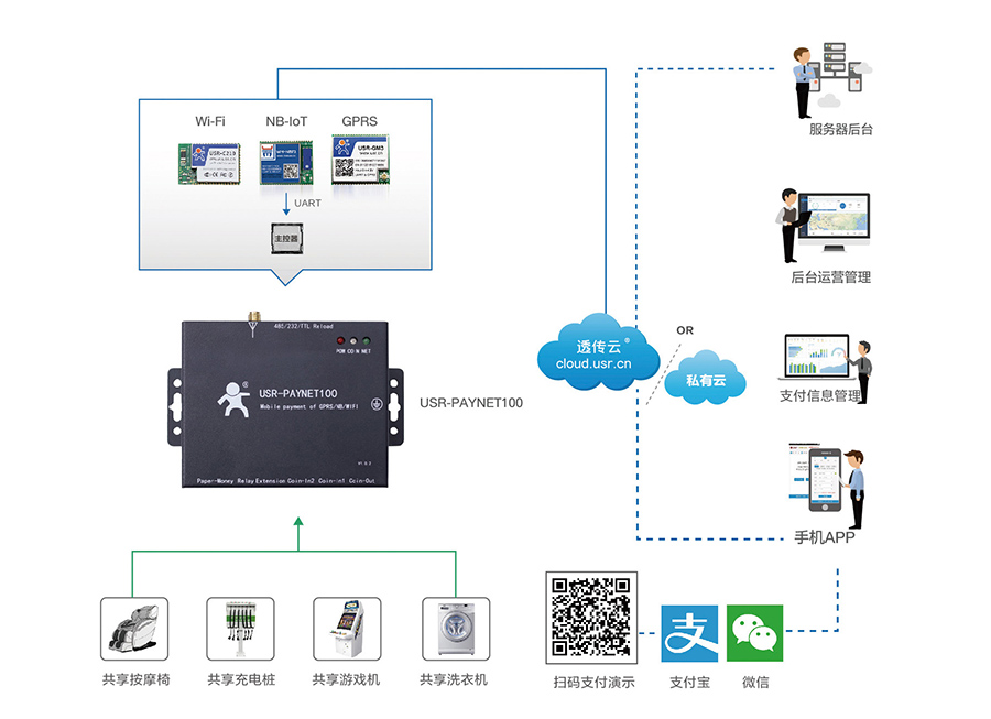 凡帶有投幣器接口的設(shè)備,借助有人物聯(lián)網(wǎng)掃碼支付解決方案,均可直接改造實現(xiàn)基于手機的掃碼支付共享方案: