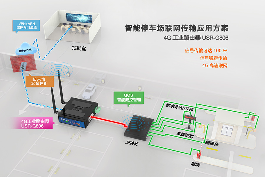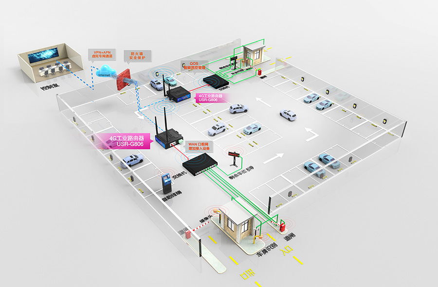 1、當(dāng)車輛離場時(shí),終端識(shí)別和傳感設(shè)備會(huì)自動(dòng)采集車輛號(hào)牌等信息,并通過4G工業(yè)無線路由器USR-G806傳輸至遠(yuǎn)程控制中心;