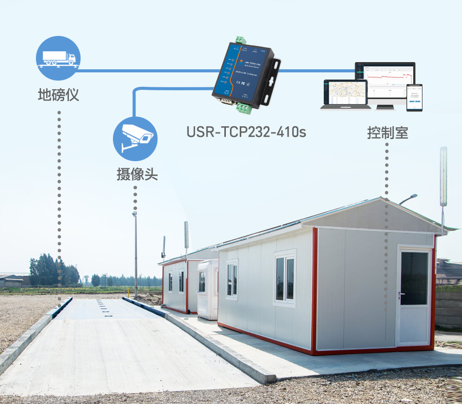 2、RS232/485串口可與現(xiàn)場設備進行通訊,通過雙串口服務器USR-TCP232-410s將稱重傳感器與工控機相連,接入局域網